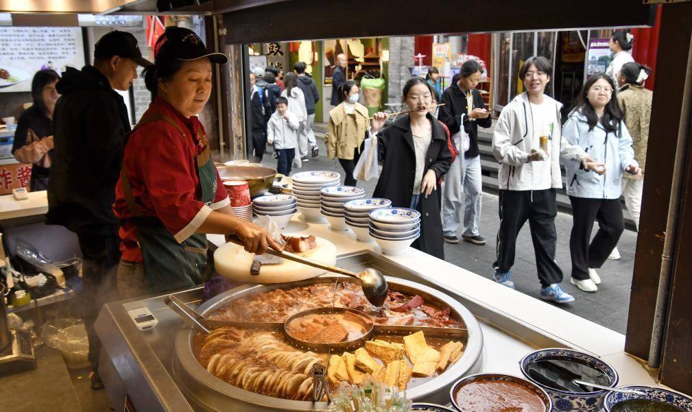 10月6日,游客在北京烟袋斜街品尝美食。新华社记者 李欣 摄