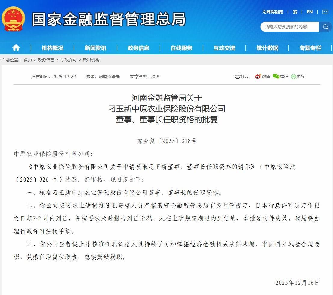 【大河财立方消息】12月22日,河南金融监管局批复,核准刁玉新中原农业保险股份有限公司董事、董事长的任职资格。