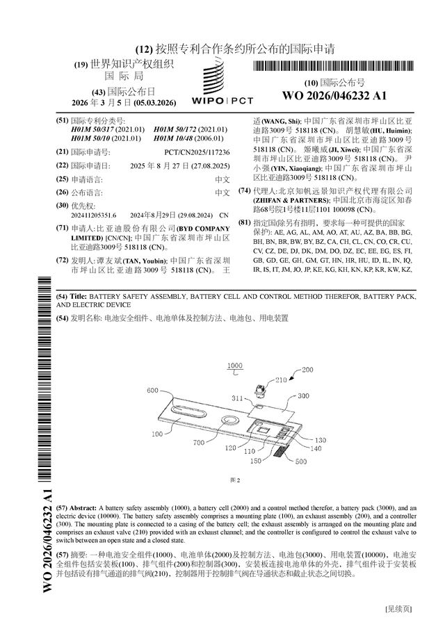 证券之星消息,根据企查查数据显示比亚迪(002594)公布了一项国际专利申请,专利名为“电池安全组件、电池单体及控制方法、电池包、用电装置”,专利申请号为PCT/CN2025/117236,国际公布日为2026年3月5日。