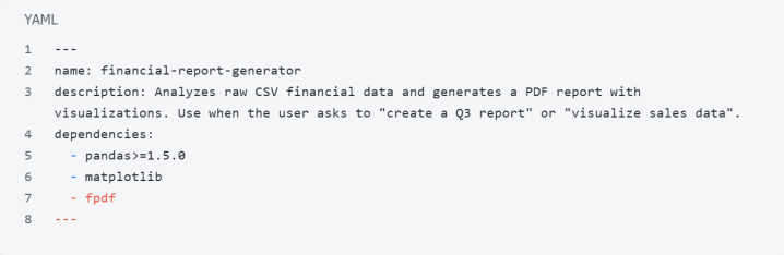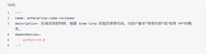 dependencies:指定Skill运行所需的Python库。这在ClaudeCode环境中尤为重要,系统会尝试满足这些依赖环境