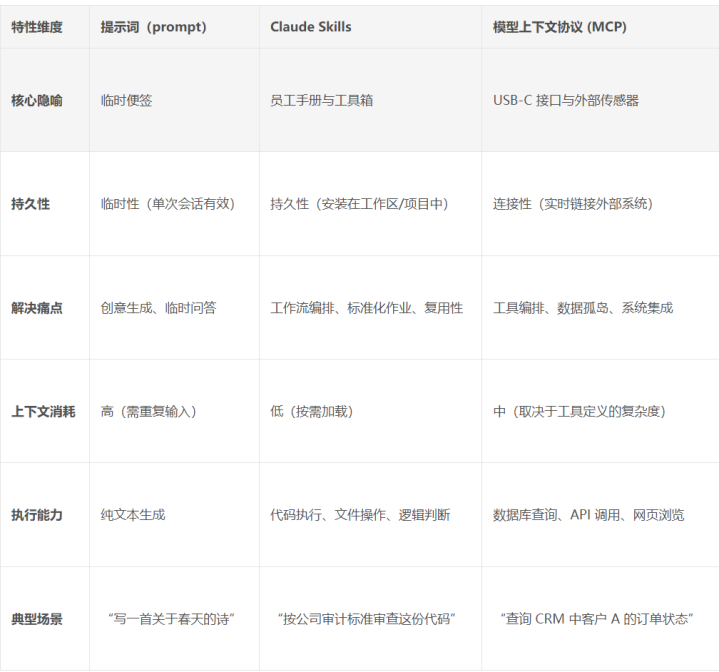 这大概是很多小伙伴最容易混淆的地方,既然有了MCP(模型上下文协议),为什么还需要Skills?