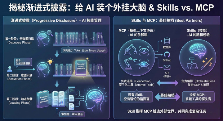 Prompt的时代正在被ClaudeSkills彻底颠覆。这款工具将零散的提示词转化为持久化、模块化的能力包,让AI不再‘失忆’,而是真正掌握程序性知识和执行逻辑。通过渐进式披露的精妙设计,Skills实现了数百种能力的懒加载,同时与MCP形成完美互补。本文不仅详解Skills的核心机制,更手把手教你打造企业级代码审查专家,揭示AI从‘工具’跃升为‘数字员工’的关键进化。