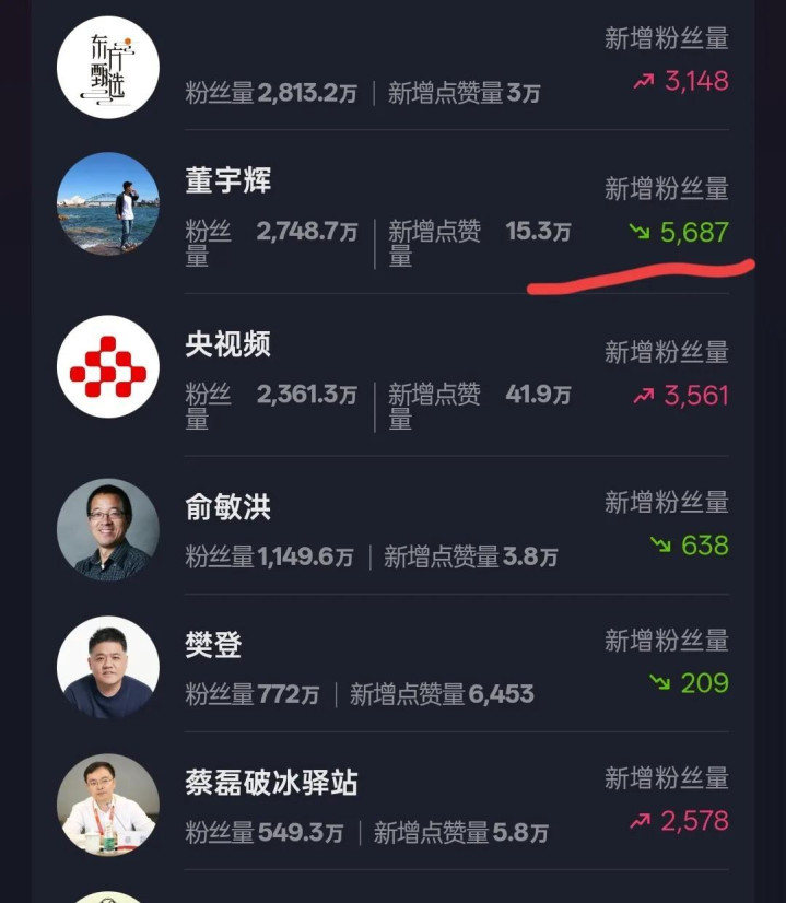 最近几天,抖音网红董宇辉持续掉粉,少则一天五六千,多则一万多,大有不可遏制的趋势。有人说会不会跟李亚鹏火热有关,我认为关系不大。一来他俩不是一个类型,也不是一个路线。喜欢李亚鹏的大概率不会喜欢董宇辉,喜欢董宇辉的大概率也不喜欢李亚鹏。再说,即便两个都喜欢,也没必要因为喜欢李亚鹏就取关董宇辉。